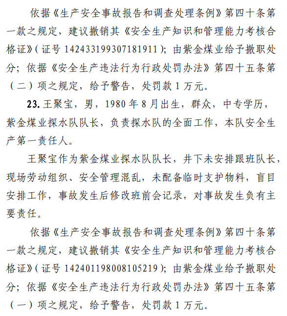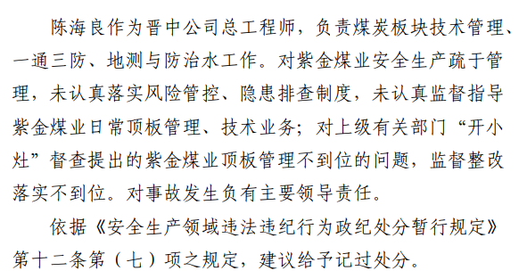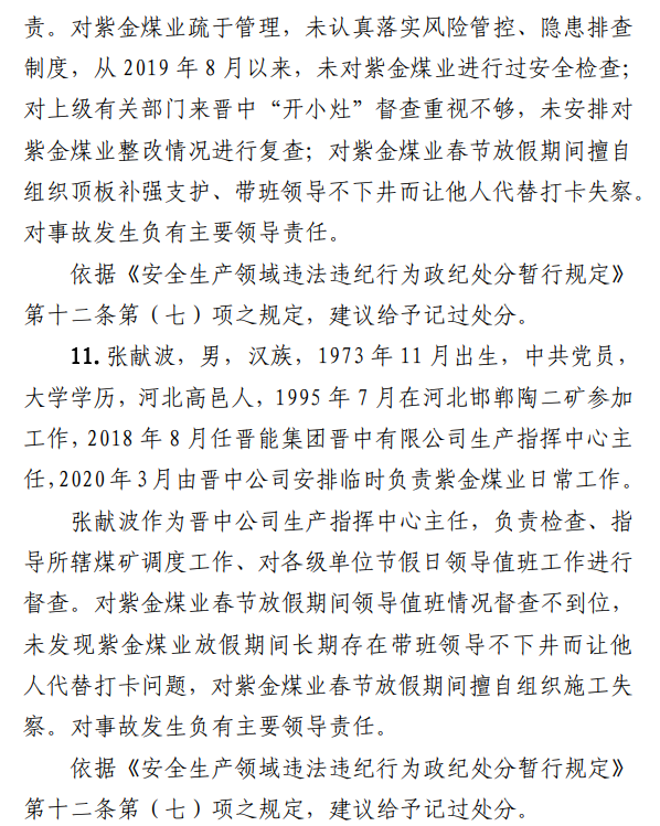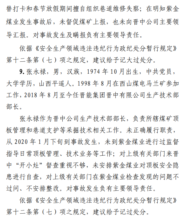 2月23日20時(shí)44分,探水隊(duì)副隊(duì)長(zhǎng)王志平通過6103回風(fēng)順槽距開口950m處的電話,向礦調(diào)度室匯報(bào)了事故情況。20時(shí)46分,調(diào)度值班人員張宏強(qiáng)向礦長(zhǎng)郭英杰匯報(bào)事故情況。郭英杰立即啟動(dòng)應(yīng)急救援預(yù)案,組織煤礦相關(guān)人員開展搶險(xiǎn)救援工作。救援人員使用單體液壓支柱、半圓木、鉸接梁對(duì)事故地點(diǎn)外圍巷道進(jìn)行臨時(shí)支護(hù),然后由外到里清渣、支護(hù),實(shí)施救援。被冒落頂板埋壓的劉永生、馬練水和王秀國(guó)于2月24日14時(shí)30分、2月25日6時(shí)30分、2月25日14時(shí)分別被救出升井。經(jīng)醫(yī)生在井口確認(rèn),3人已無生命體征,之后被送往榆次區(qū)殯儀館,搶險(xiǎn)救援工作結(jié)束。事故瞞報(bào)、謊報(bào)經(jīng)過2月24日,礦長(zhǎng)郭英杰安排信息中心主任梁煥修改人員定位系統(tǒng),關(guān)閉了工業(yè)視頻,刪除調(diào)度錄音通訊、虹膜數(shù)據(jù)。2月25日17時(shí)許,紫金煤業(yè)紀(jì)檢書記、黨總支副書記高建忠(臨時(shí)主持紫金煤業(yè)董事會(huì)及黨務(wù)日常事務(wù))和礦長(zhǎng)郭英杰組織召開煤礦管理層會(huì)議。會(huì)上郭英杰、高建忠、紫金煤業(yè)安全生產(chǎn)技術(shù)總監(jiān)南海為了瞞報(bào)事故,對(duì)偽造出入井?dāng)?shù)據(jù)、修改人員定位數(shù)據(jù)、銷毀調(diào)度電話錄音、刪除視頻監(jiān)控資料、清理井下事故現(xiàn)場(chǎng)等事項(xiàng)進(jìn)行了安排。2月24日至25日,高建忠安排生產(chǎn)副礦長(zhǎng)杜永忠、安全副礦長(zhǎng)楊雙喜等人與遇難者家屬協(xié)商辦理賠償事宜,并安排遇難者家屬配合礦方瞞報(bào)事故。3月5日,在榆次區(qū)人民政府組織的核查過程中,郭英杰、高建忠均否認(rèn)事故發(fā)生,郭英杰、高建忠、南海繼續(xù)安排煤礦有關(guān)工作人員瞞報(bào)事故。3月8日上午9時(shí)許,在榆次區(qū)人民政府已查實(shí)事故、正在擬文上報(bào)的期間,紫金煤業(yè)向山西煤銷晉中公司、榆次區(qū)應(yīng)急管理局和晉中煤監(jiān)分局電話匯報(bào)事故,稱三名巡檢人員走到事故地點(diǎn)時(shí),頂板突然冒落導(dǎo)致事故發(fā)生,謊報(bào)了事故的經(jīng)過和原因。2月23日22時(shí)左右,武全珍在井下安排王家偉完善措施內(nèi)容。王家偉出井后在措施中增加了:“頂板較完整區(qū)域補(bǔ)強(qiáng)支護(hù)期間采用單體支柱+鉸接頂梁做臨時(shí)支護(hù),頂板不平整處使用方木墊平、木楔背緊背實(shí)”,和“臨時(shí)支護(hù)安全技術(shù)措施”相關(guān)內(nèi)容。2月24日上午,武全珍安排王家偉在該措施中增加了“絞車運(yùn)輸安全技術(shù)措施”和“移動(dòng)乳化液泵使用安全技術(shù)措施”等內(nèi)容。3月8日,生產(chǎn)礦長(zhǎng)杜永忠安排探水隊(duì)隊(duì)長(zhǎng)王聚寶在班前會(huì)記錄中加上“先抽400米水”。當(dāng)天晚上,安全礦長(zhǎng)楊雙喜在在班前會(huì)記錄中加上“不準(zhǔn)進(jìn)尺,打好臨時(shí)支護(hù)再作業(yè)”等內(nèi)容。現(xiàn)場(chǎng)人員在無臨時(shí)支護(hù)的情況下違章進(jìn)行補(bǔ)強(qiáng)支護(hù)作業(yè),施工過程中頂板失穩(wěn)冒落,導(dǎo)致事故發(fā)生。1.紫金煤業(yè)對(duì)處于極限平衡狀態(tài)的6103回風(fēng)順槽頂板存在的安全隱患辨識(shí)不清、安全風(fēng)險(xiǎn)管控不力6103回風(fēng)順槽巷道埋深大、圍巖較軟,且為迎采對(duì)掘巷道,受臨近的6101工作面開采動(dòng)壓影響大,多根錨桿錨索斷裂失效,巷道變形,底板鼓起,事故地點(diǎn)附近巷道頂板已處于高應(yīng)力的極限平衡狀態(tài)。事故發(fā)生前,事故地點(diǎn)附近巷道頂板已先后發(fā)生兩次冒落。紫金煤業(yè)對(duì)6103回風(fēng)順槽頂板存在的安全隱患辨識(shí)不清、重視不夠,未切實(shí)進(jìn)行礦壓日常監(jiān)測(cè)分析,未對(duì)斷裂失效錨桿及時(shí)補(bǔ)強(qiáng)支護(hù),施工時(shí)未采取臨時(shí)支護(hù),安全風(fēng)險(xiǎn)管控不力。2.紫金煤業(yè)技術(shù)管理工作有漏洞,《6103回風(fēng)順槽補(bǔ)強(qiáng)支護(hù)施工安全技術(shù)措施》對(duì)現(xiàn)場(chǎng)作業(yè)指導(dǎo)性差紫金煤業(yè)編制的《6103回風(fēng)順槽補(bǔ)強(qiáng)支護(hù)施工安全技術(shù)措施》對(duì)巷道補(bǔ)強(qiáng)支護(hù)作業(yè)的臨時(shí)支護(hù)形式、技術(shù)參數(shù)和要求不具體,對(duì)現(xiàn)場(chǎng)作業(yè)指導(dǎo)性差。生產(chǎn)技術(shù)科科長(zhǎng)王家偉編制措施前未到6103回風(fēng)順槽實(shí)地查看頂板情況,生產(chǎn)礦長(zhǎng)杜永忠、安全礦長(zhǎng)楊雙喜、總工程師武全珍及相關(guān)部門負(fù)責(zé)人會(huì)審措施時(shí)審查把關(guān)不嚴(yán),措施僅由探水隊(duì)隊(duì)長(zhǎng)在班前會(huì)進(jìn)行宣讀,學(xué)習(xí)貫徹不到位。3.6103回風(fēng)順槽補(bǔ)強(qiáng)支護(hù)作業(yè)勞動(dòng)組織混亂,現(xiàn)場(chǎng)安全監(jiān)管缺位事故當(dāng)班,在探水隊(duì)隊(duì)長(zhǎng)提出本隊(duì)人員不熟悉支護(hù)作業(yè)的情況下,礦領(lǐng)導(dǎo)違章指揮,仍然抽調(diào)安監(jiān)科和探水隊(duì)人員進(jìn)行支護(hù)作業(yè)。作業(yè)人員安全風(fēng)險(xiǎn)辨