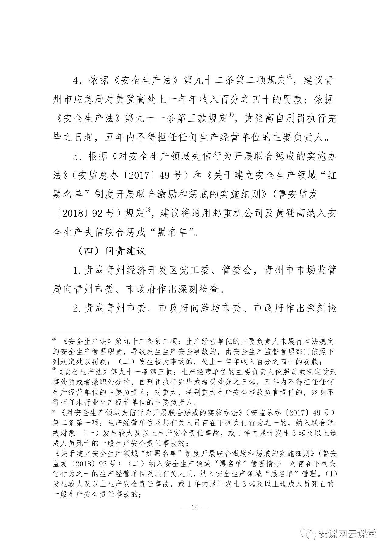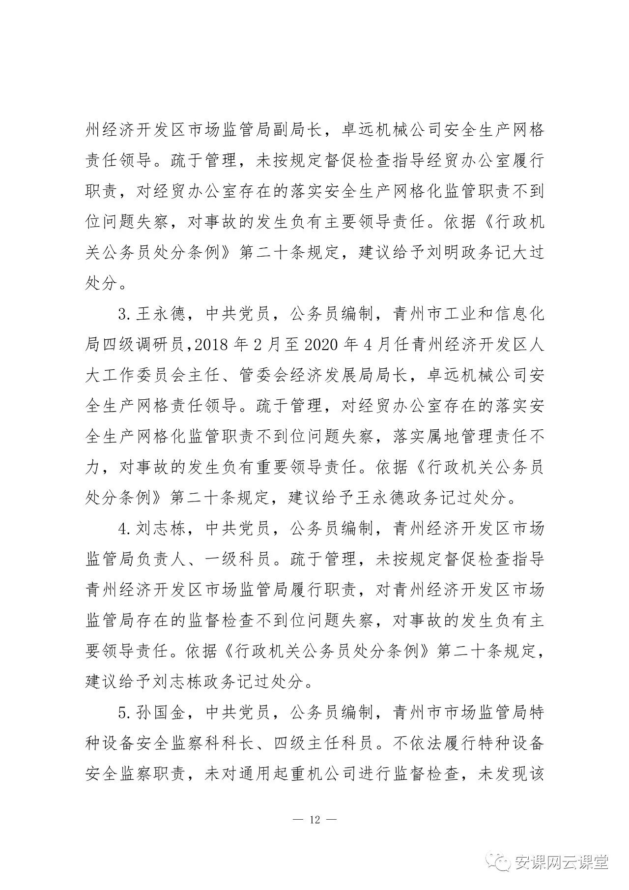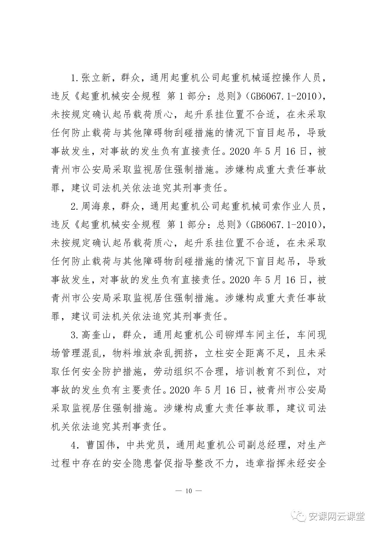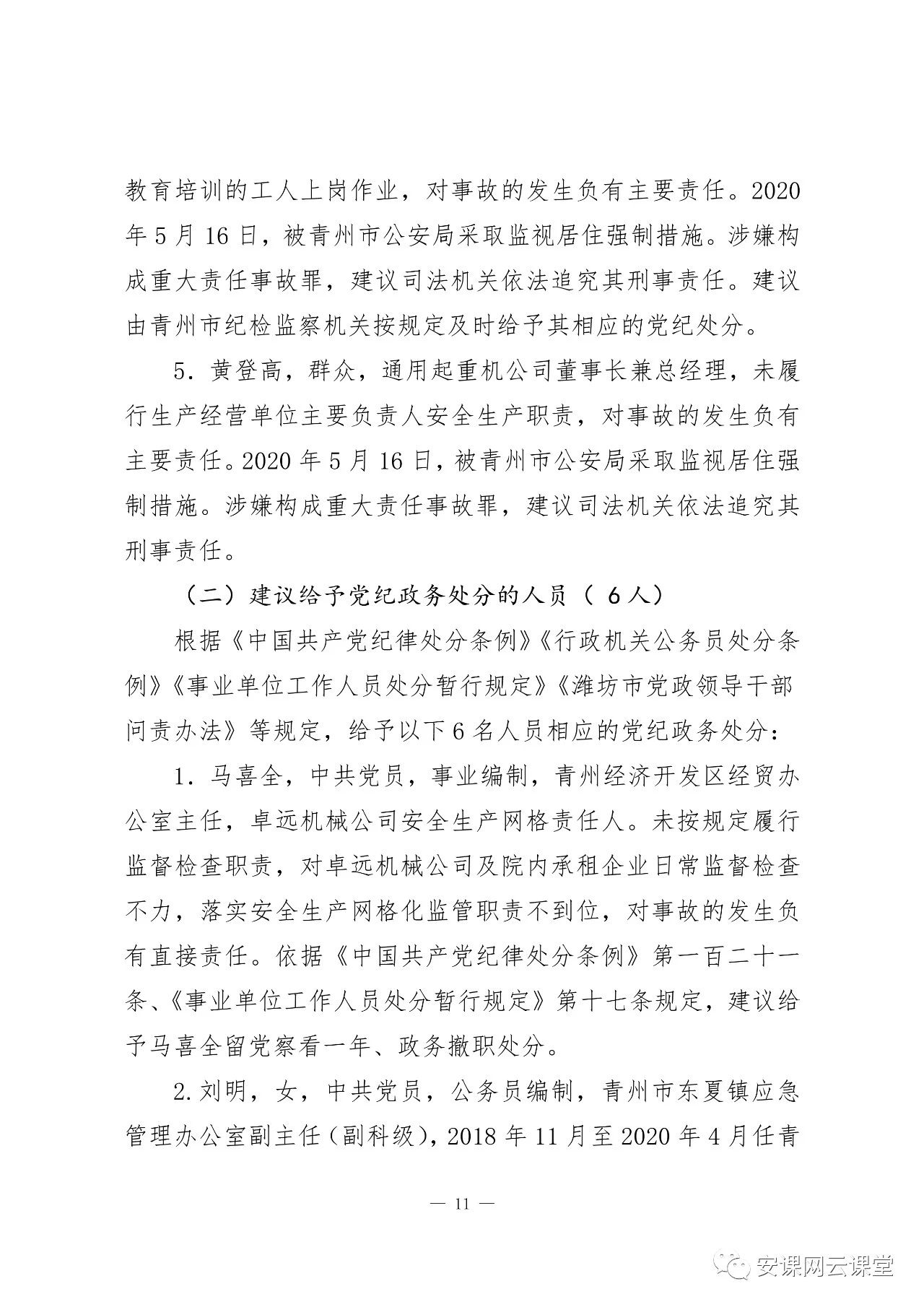 2020年5 月16 日,被青州市公安局采取監(jiān)視居住強制措施。涉嫌構(gòu)成重大責任事故罪,建議司法機關(guān)依法追究其刑事責任。建議由青州市紀檢監(jiān)察機關(guān)按規(guī)定及時給予其相應(yīng)的黨紀處分。