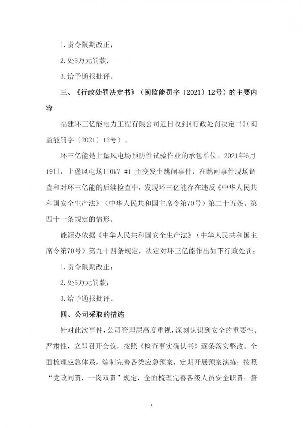 《公告》顯示,2021年6月19日,因上堡風電場110kV#1主變發(fā)生跳閘事件,在跳閘事件現(xiàn)場調查和對閩東電力的后續(xù)檢查中,發(fā)現(xiàn)閩東電力、蕉城閩電、環(huán)三億能均存在違反相關法律條文的情況,分別處以10萬元、5萬元、5萬元的罰款。
